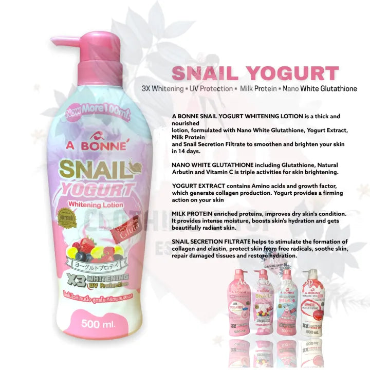 The A Bonne Snail Yogurt Lotion is a luxuriously thick and nourishing skincare lotion that boasts a potent combination of Glutathione, Yogurt Extract, Milk Protein, and Snail Secretion Filtrate to promote smoother and brighter skin.