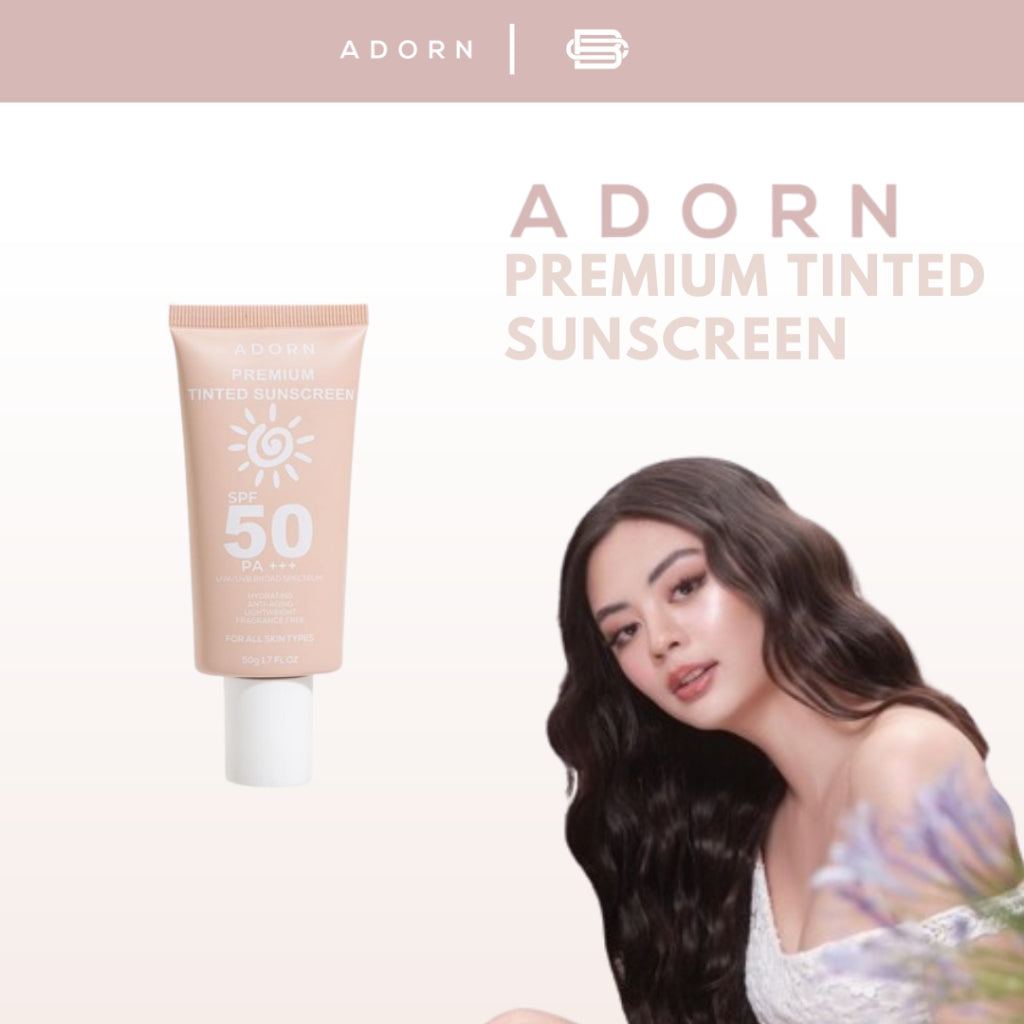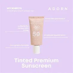 Adorn Tinted Sunscreen SPF 50 PA+++ is a lightweight, non-greasy, broad-spectrum sunscreen that provides strong UVA and UVB protection while offering natural-looking tinted coverage and skin-nourishing benefits suitable for all skin types.