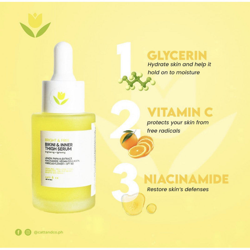 Catt & Co Bikini & Inner Thigh Serum Brighten Your bikini area deserves just as much love as the rest of your body. That’s why we created & &—a powerful, natural serum designed to even out discoloration in your most sensitive areas.This highly concentrated formula is packed with effective, skin-safe brightening actives like lemon extract, papaya enzymes, and other plant-based ingredients that gently target hyperpigmentation and restore confidence, one drop at a time.