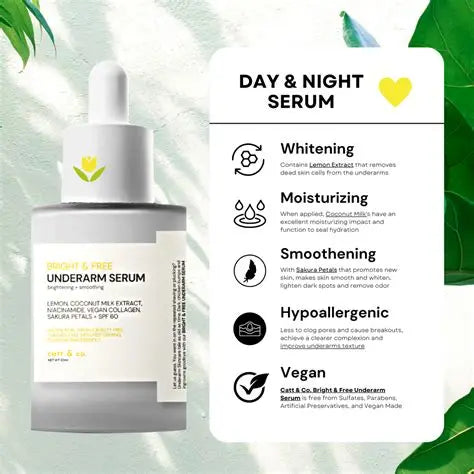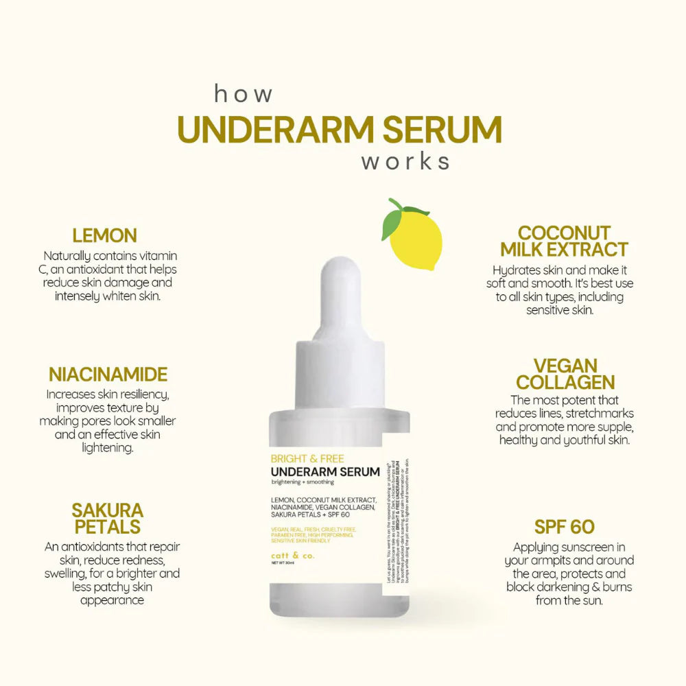 Catt & Co Underarm Serum is a natural, vegan, cruelty-free skincare product designed to lighten dark underarms, smooth skin texture, and reduce odor and sweat with effective and gentle ingredients suitable for all skin types.
