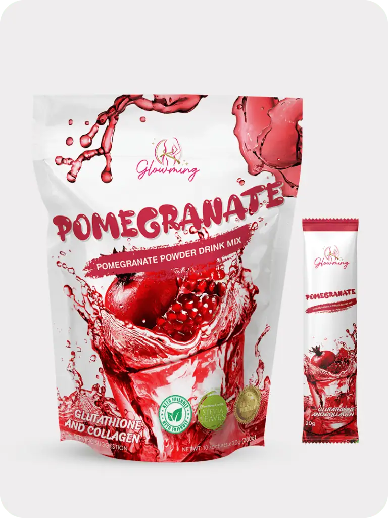 Glowming Shape Pomegranate by CC Glam is a nutrient-rich collagen and glutathione drink designed to support detoxification, radiant skin, gut health, and overall wellness in a convenient sachet form.
