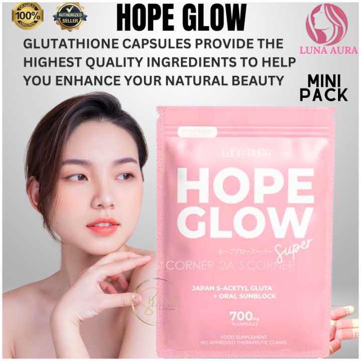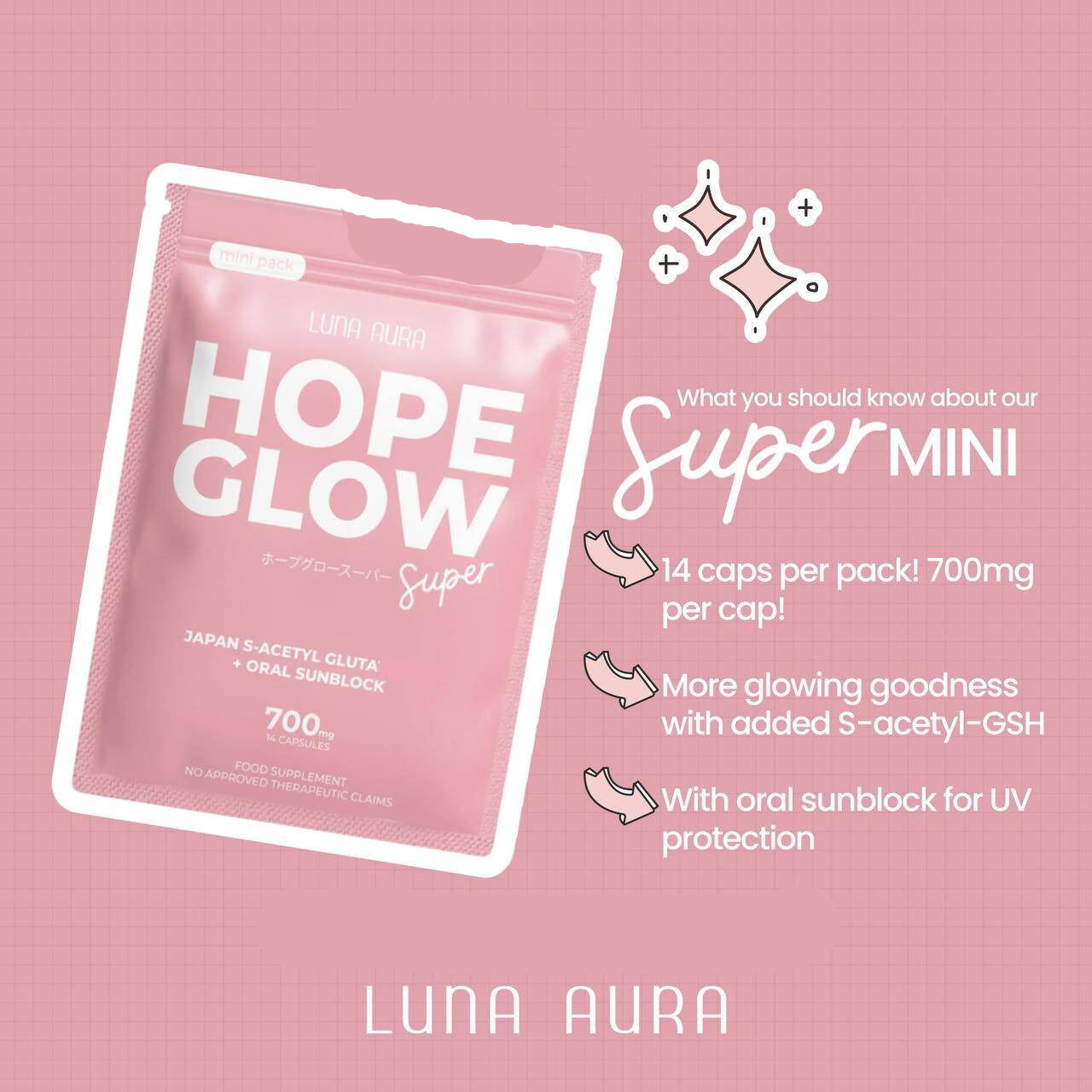 Luna Aura Hope Glow MINI is a smaller or trial-sized version of the Luna Aura Hope Glow supplements containing 700 mg Japan S-Acetyl Glutathione, formulated to help lighten skin, provide antioxidant support, aid detoxification, support immune function, and protect against UVA and UVB rays as an oral sunblock