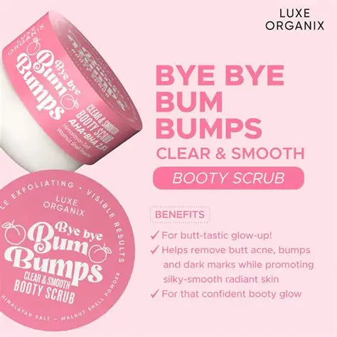Luxe Organix Bye Bye Bum Bumps Booty Scrub is a multi-functional exfoliating and hydrating product aimed at achieving smoother, brighter, and healthier-looking skin on the buttocks, while addressing common concerns like bumps, dark spots, and acne