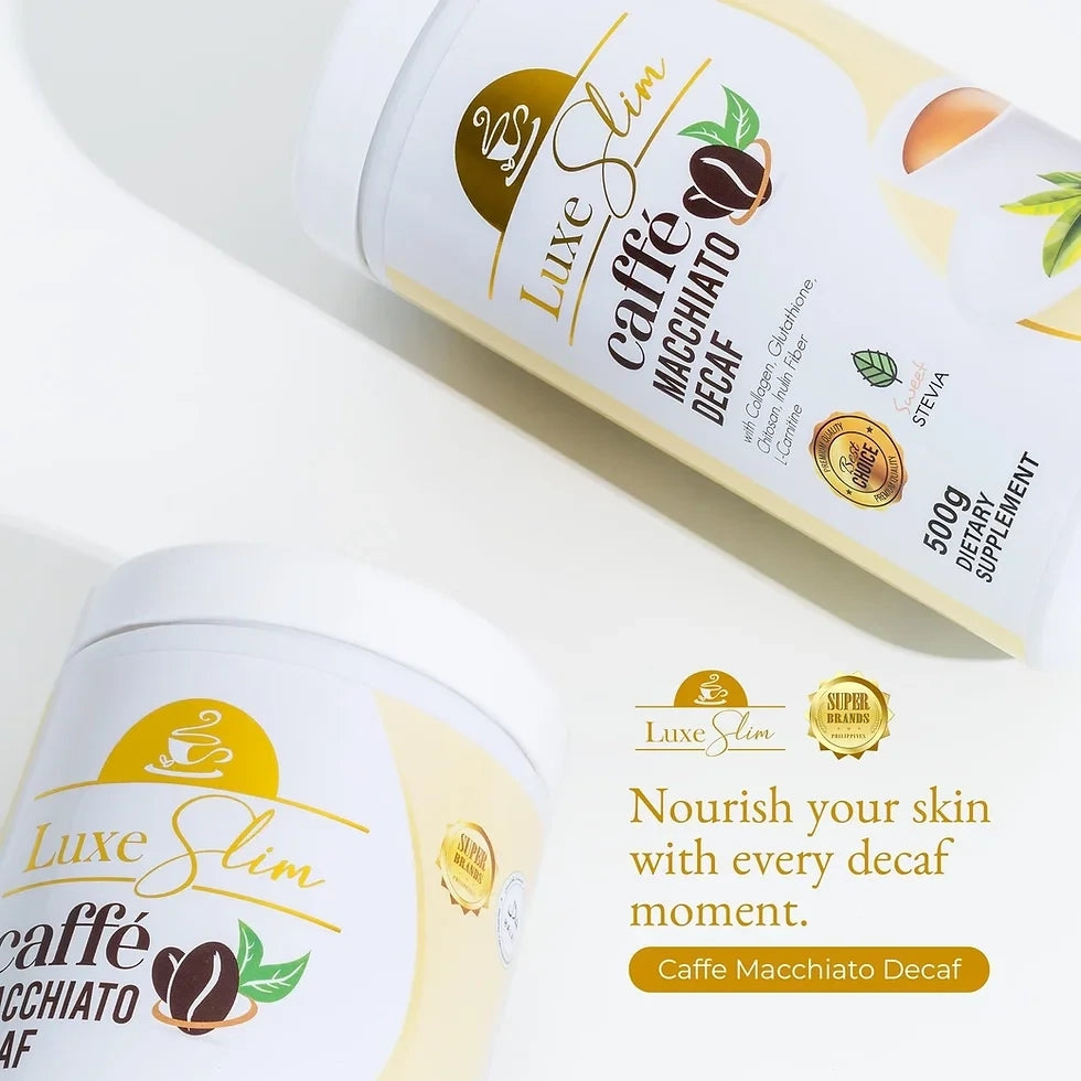 Luxe Slim Caffe Macchiato Decaf 500g is a decaffeinated coffee blend formulated to support skin radiance, digestion, energy metabolism, and overall wellness while providing a smooth, indulgent coffee experience.