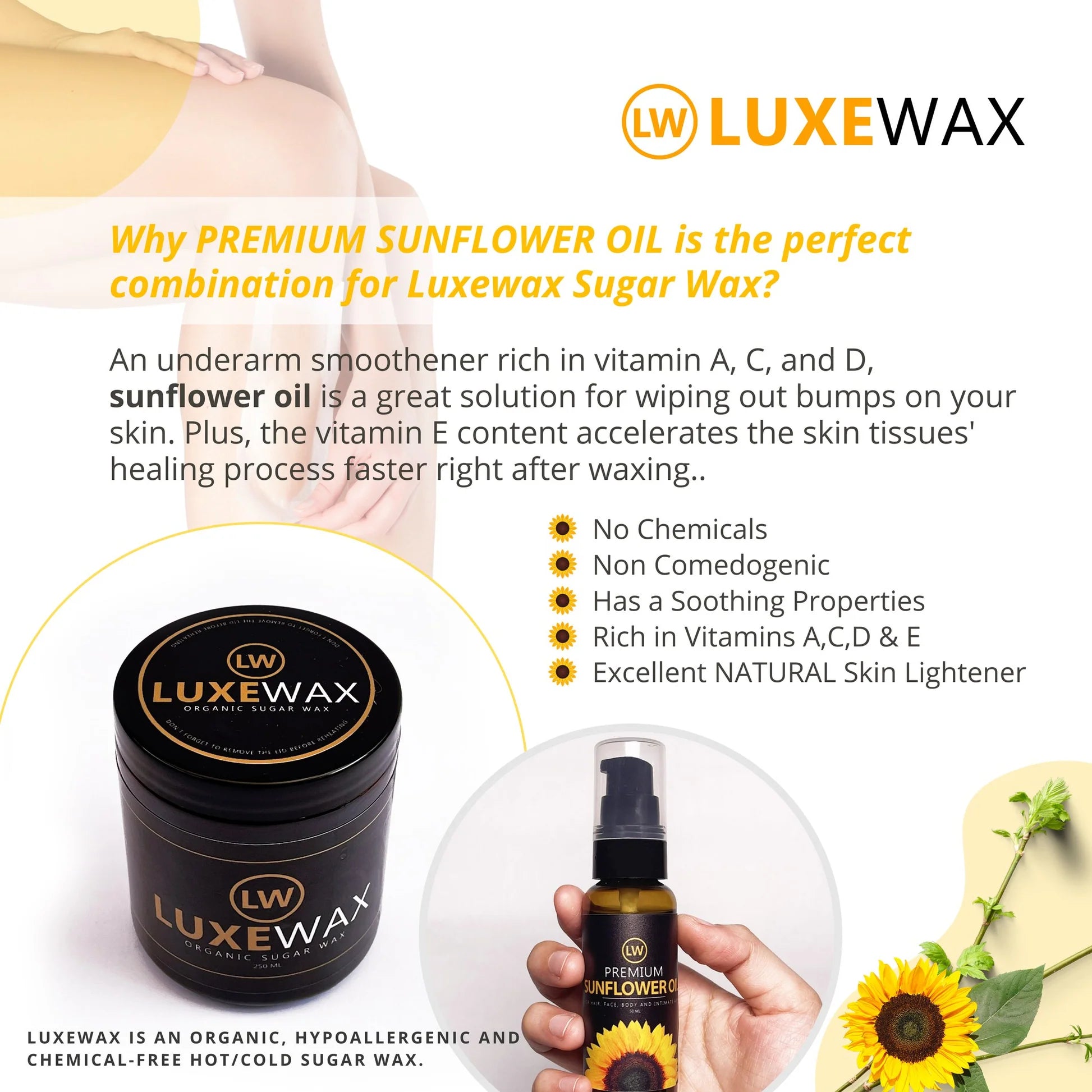 Luxewax Organic Sunflower Oil is a premium, organic aftercare oil designed to soothe, nourish, and hydrate the skin following sugar waxing, promoting a healthy, radiant complexion with its rich antioxidants and vitamins.