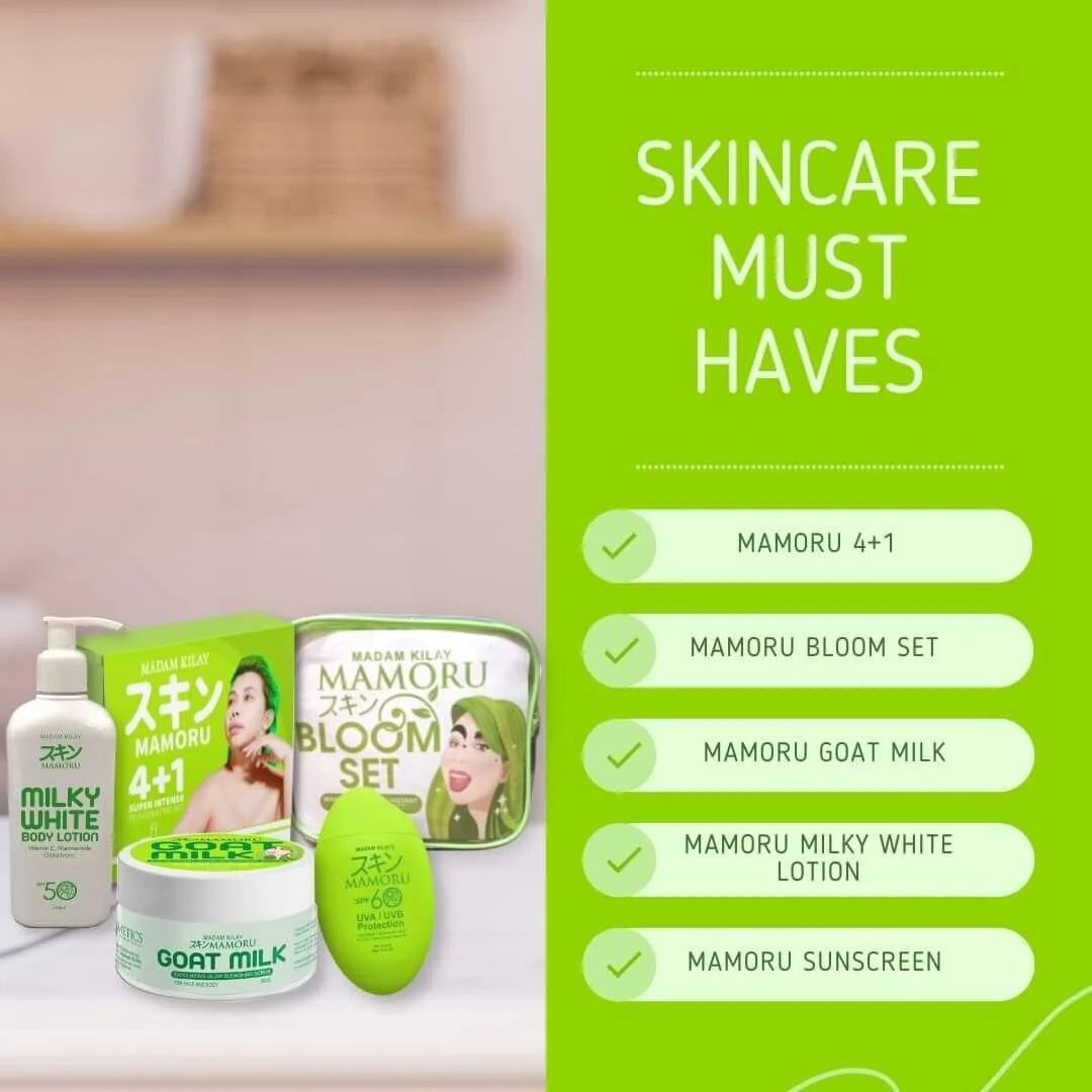 The Madam Kilay Mamoru 4+1 Super Intense Rejuvenating Set is a complete skincare system designed to stimulate collagen, rejuvenate skin cells, and reduce visible signs of aging, dark spots, and acne marks.