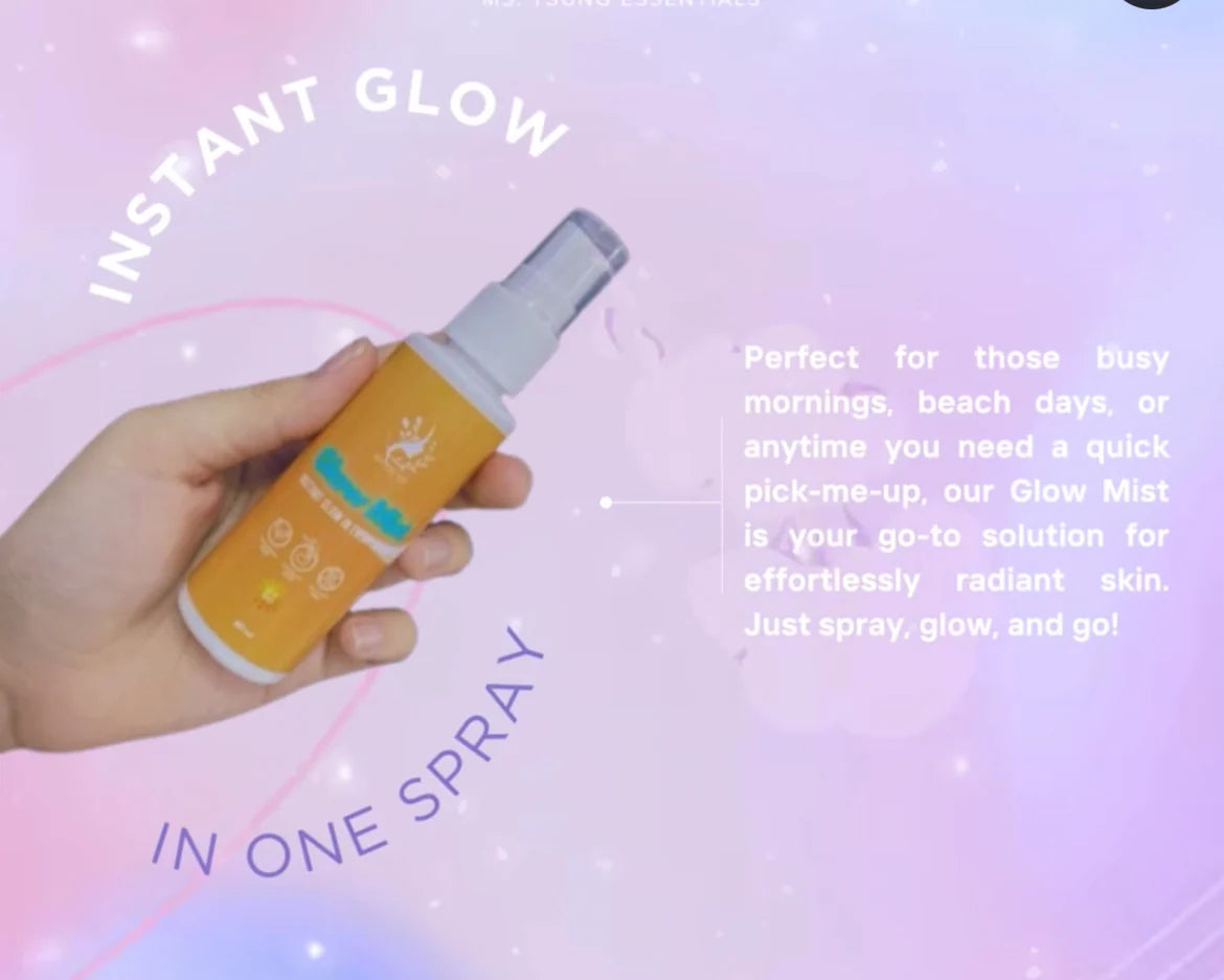 Ms. Tsung Glow Mist is a lightweight, water-based facial mist that offers SPF 50 sun protection, moisturizes the skin, and gives a glossy, glowing finish without feeling sticky or leaving a white cast.