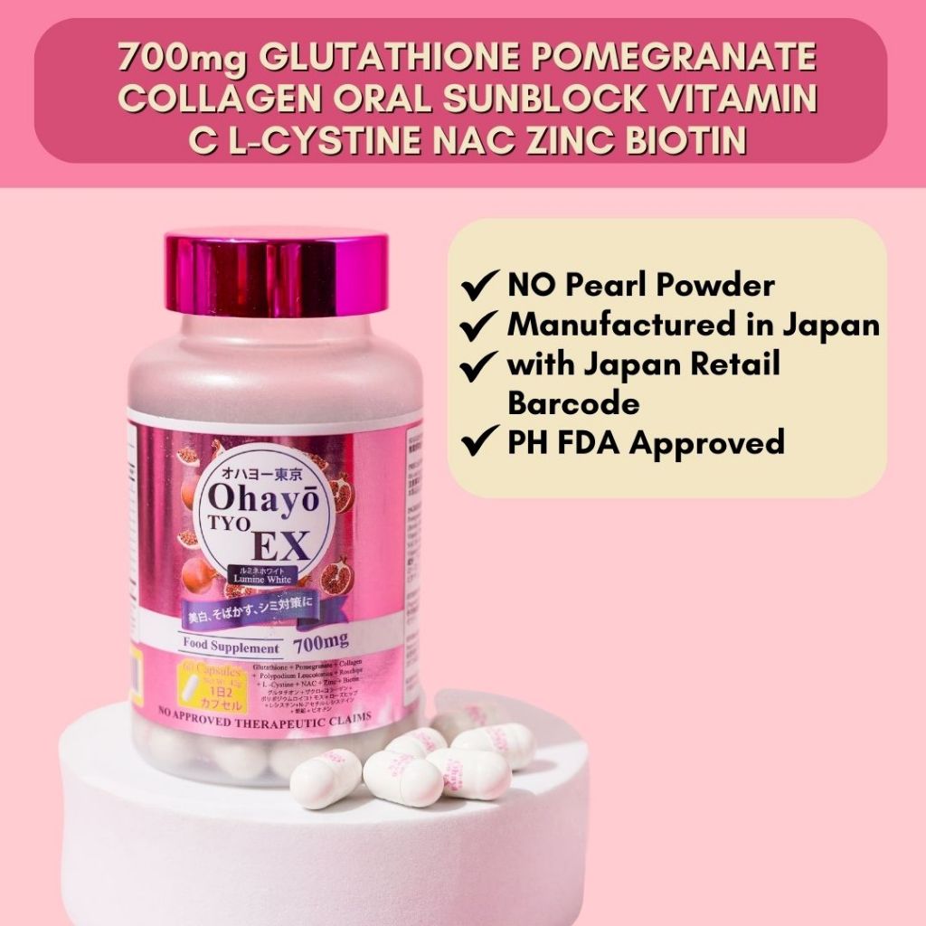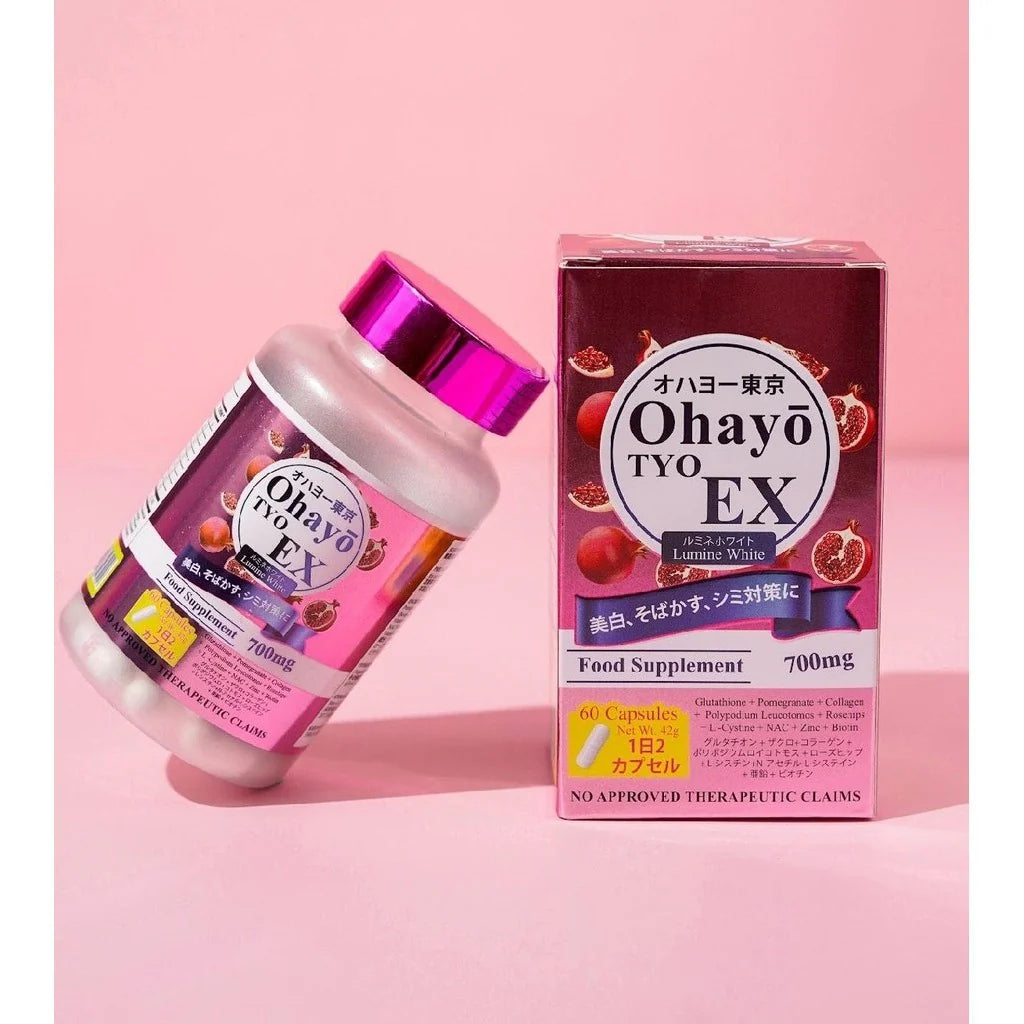 Ohayo TYO EX Lumine White is a Japanese-formulated supplement designed to brighten, even out skin tone, and promote vibrant, youthful skin using a potent blend of natural ingredients centered around 410mg of glutathione per capsule.